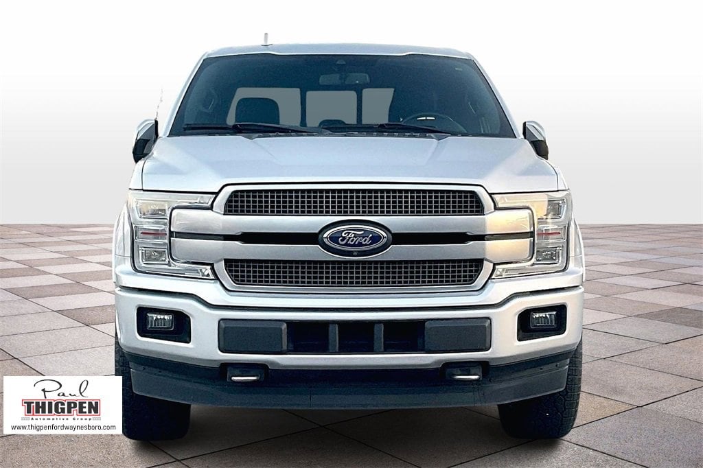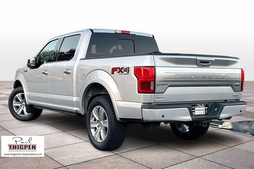 Priced below KBB Fair Purchase Price! Certified. Ingot Silver Metallic 2019 Ford F-150 Platinum 4WD 10-Speed Automatic 3.5L V6 EcoBoost Aluminum Wheels, Ford Blue Certification Certified, 4WD, 10 Speakers, 20" Polished Aluminum Wheels, 4-Wheel Disc Brakes, 4x4 FX4 Off-Road Bodyside Decal, ABS brakes, Active Park Assist, Adaptive Cruise Control, Adjustable pedals, Air Conditioning, Alloy wheels, AM/FM radio: SiriusXM, AppLink/Apple CarPlay and Android Auto, Auto High-beam Headlights, Auto tilt-away steering wheel, Auto-dimming door mirrors, Auto-dimming Rear-View mirror, Automatic temperature control, Black Unique Multi-Contour Leather Bucket Seats, Brake assist, Bumpers: body-color, Class IV Trailer Hitch Receiver, Compass, Delay-off headlights, Driver door bin, Driver vanity mirror, Dual front impact airbags, Dual front side impact airbags, Electronic Stability Control, Emergency communication system: SYNC 3 911 Assist, Engine Oil Cooler, Equipment Group 701A Luxury, Extended Range 36 Gallon Fuel Tank, Exterior Parking Camera Rear, Foldable Pickup Box Bed Extender, Front anti-roll bar, Front Bucket Seats, Front Center Armrest, Front dual zone A/C, Front fog lights, Front reading lights, Front wheel independent suspension, Fully automatic headlights, FX4 Off-Road Package, Garage door transmitter, Genuine wood door panel insert, GVWR: 7,050 lbs Payload Package, Heated door mirrors, Heated front seats, Heated rear seats, Heated steering wheel, Hill Descent Control, Illuminated entry, Integrated Trailer Brake Controller, Lane-Keeping System, Low tire pressure warning, Max Trailer Tow Package, Memory seat, Navigation System, Occupant sensing airbag, Off-Road Tuned Front Shock Absorbers, Outside temperature display, Overhead airbag, Overhead console, Panic alarm, Passenger door bin, Passenger vanity mirror, Pedal memory, Power door mirrors, Power driver seat, Power passenger seat, Power steering, Power windows, Pro Trailer Backup Assist, Radio data system, Radio: B&O Sound System by Bang & Olufsen, Rain sensing wipers, Rear Parking Sensors, Rear reading lights, Rear seat center armrest, Rear step bumper, Rear window defroster, Remote keyless entry, Security system, SiriusXM Radio, Speed control, Speed-sensing steering, Split folding rear seat, Steering wheel memory, Steering wheel mounted audio controls, SYNC 3, Tachometer, Tailgate Step w/Tailgate Lift Assist, Technology Package, Telescoping steering wheel, Tilt steering wheel, Traction control, Tray Style Floor Liner, Trip computer, Turn signal indicator mirrors, Twin Panel Moonroof, Upgraded Front Stabilizer Bar, Variably intermittent wipers, Ventilated front seats, Voice-Activated Touchscreen Navigation, Voltmeter, 4WD.
