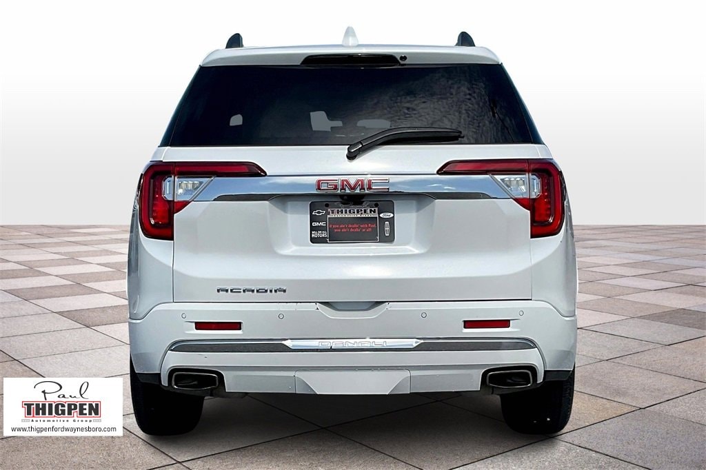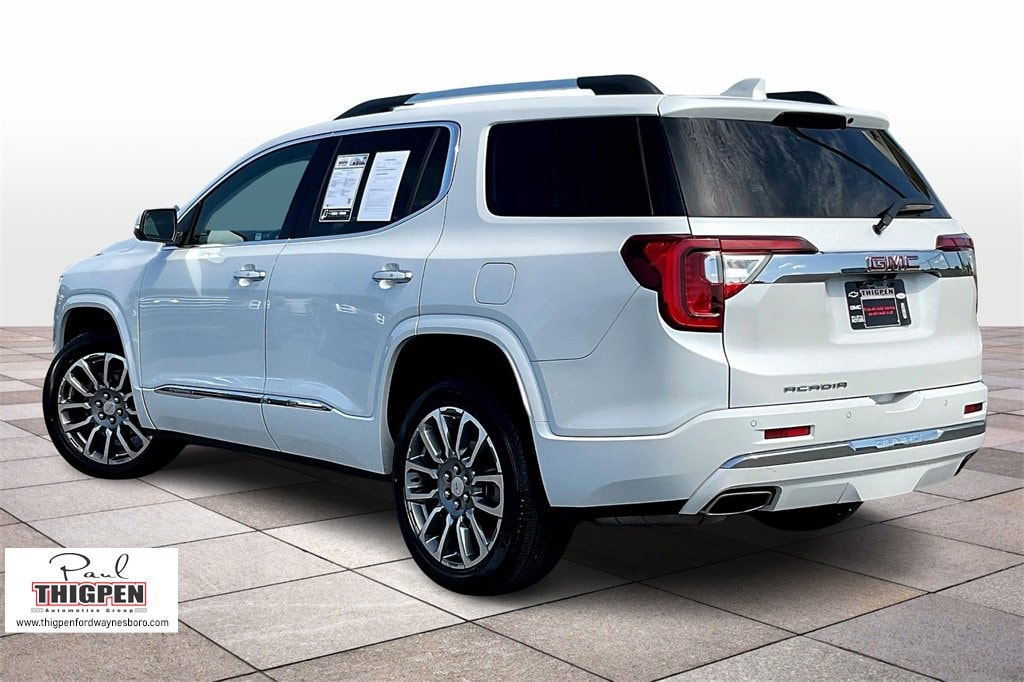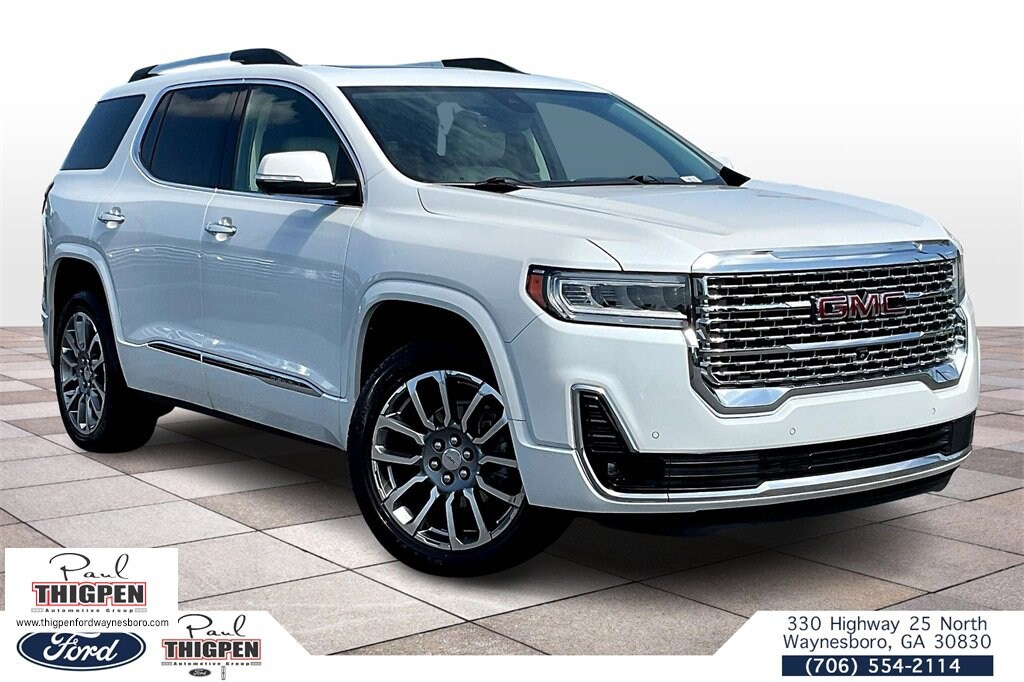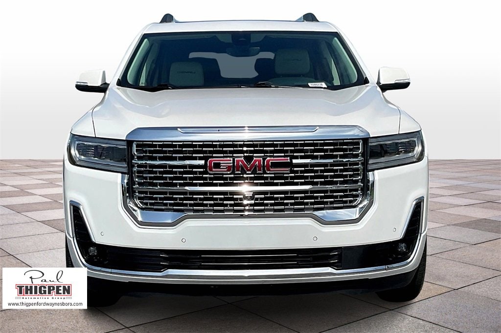 Certified. White Frost Tricoat 2023 GMC Acadia Denali FWD 9-Speed Automatic 3.6L V6 SIDI Bluetooth, FWD, Dark Galvanized/Light Shale Leather.