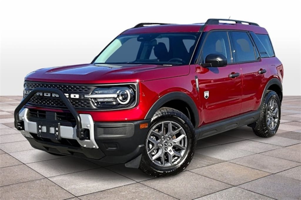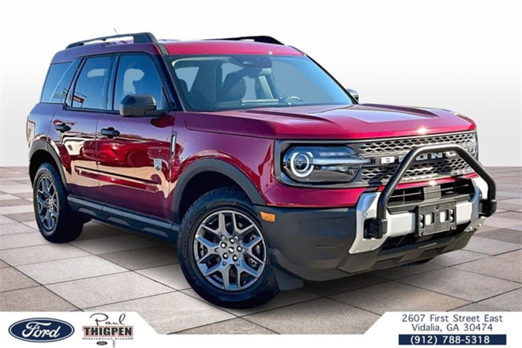 Ruby Red Metallic 2025 Ford Bronco Sport Big Bend 4WD 8-Speed Automatic 1.5L EcoBoost Vidalia Ford Lincoln 2607 E 1st St Vidalia, Georgia 30474 912-788-5318 Black Diamond Off-Road Package (110V/400W AC Power Outlet, 2nd Row Carpeted Seatback, Auxiliary Switches & Wiring, Brush Guard, Cargo Management System (Shelf/Divider/Table), Cargo Mat, Class II Trailer Tow Pack w/Trailer Sway Control, Fender Tie Downs, Front & Rear Black Bumpers, Interior Grab Handle, Recovery Hooks, and Wheels: 17" Carbonized Gray Painted Aluminum), Equipment Group 200A, 4D Sport Utility, 1.5L EcoBoost, 8-Speed Automatic, 4WD, 4-Wheel Disc Brakes, 6 Speakers, ABS brakes, Air Conditioning, Alloy wheels, AM/FM radio: SiriusXM, AM/FM Stereo, Auto High-beam Headlights, Automatic temperature control, Brake assist, Cloth w/Easy-to-Clean Front Bucket Seats, Compass, Delay-off headlights, Driver door bin, Driver vanity mirror, Dual front impact airbags, Dual front side impact airbags, Electronic Stability Control, Emergency communication system: SYNC 4 911 Assist, Four wheel independent suspension, Front anti-roll bar, Front Bucket Seats, Front Center Armrest, Front License Plate Bracket, Front reading lights, Fully automatic headlights, Heated door mirrors, Illuminated entry, Knee airbag, Low tire pressure warning, Occupant sensing airbag, Outside temperature display, Overhead airbag, Overhead console, Panic alarm, Passenger door bin, Passenger vanity mirror, Power door mirrors, Power steering, Power windows, Radio data system, Rear anti-roll bar, Rear Parking Sensors, Rear reading lights, Rear seat center armrest, Rear window defroster, Rear window wiper, Remote keyless entry, Security system, SiriusXM, Speed control, Speed-sensing steering, Speed-Sensitive Wipers, Split folding rear seat, Steering wheel mounted audio controls, SYNC 4 w/Enhanced Voice Recognition, Tachometer, Telescoping steering wheel, Tilt steering wheel, Traction control, Trip computer, and Wheels: 17" Carbonized Gray-Painted Aluminum. 13.2" HD Color Touchscreen, Auto LED Headlights, Backup Camera, Off Road Package, Skid Plate Package, 4D Sport Utility, 1.5L EcoBoost, 8-Speed Automatic, 4WD, 110V/400W AC Power Outlet, 2nd Row Carpeted Seatback, Auxiliary Switches & Wiring, Black Diamond Off-Road Package, Brush Guard, Cargo Management System (Shelf/Divider/Table), Cargo Mat, Class II Trailer Tow Pack w/Trailer Sway Control, Equipment Group 200A, Fender Tie Downs, Front & Rear Black Bumpers, Interior Grab Handle, Recovery Hooks, Wheels: 17" Carbonized Gray Painted Aluminum. Price includes: $1000 - Final Days Mega Bonus Cash. Exp. 01/02/2026 $1500 - Retail Bonus Cash. Exp. 01/05/2026 $500 - Retail Bonus Cash. Exp. 01/05/2026