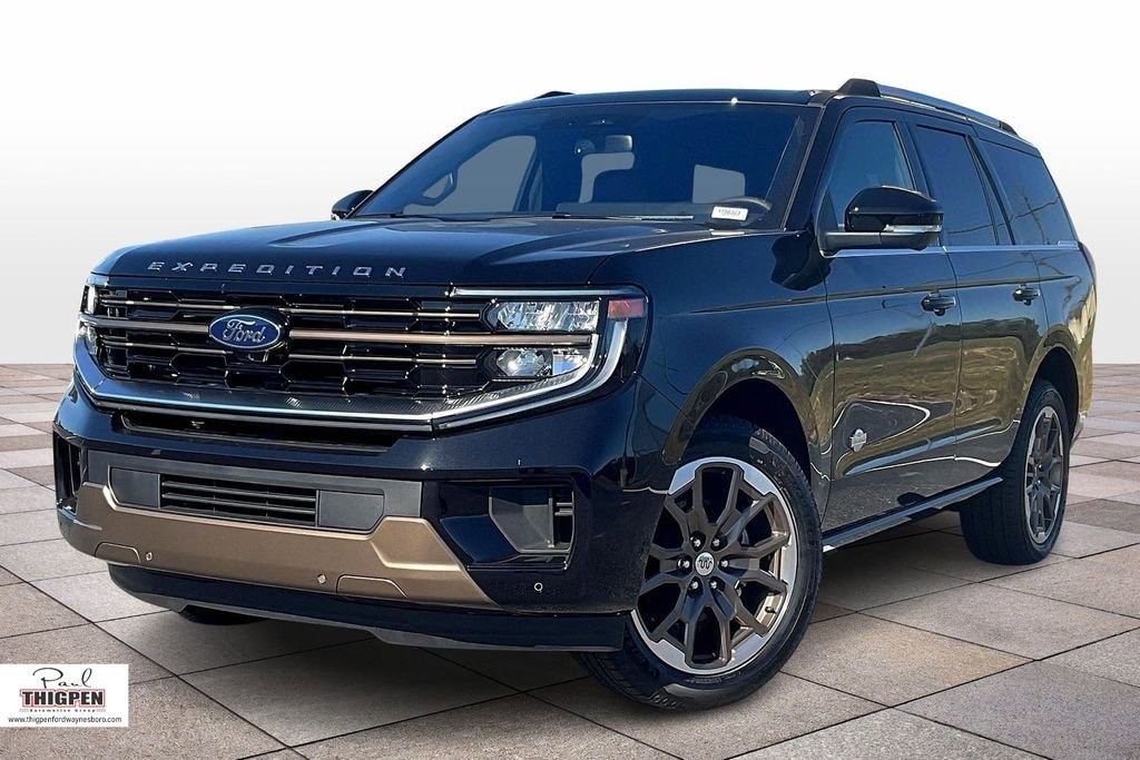 Agate Black Metallic 2025 Ford Expedition King Ranch 4WD 10-Speed Automatic EcoBoost 3.5L V6 GTDi DOHC 24V Twin Turbocharged 4WD, 22 Speakers, 3.73 Axle Ratio, 3rd row seats: split-bench, 4-Wheel Disc Brakes, ABS brakes, Adaptive suspension, Adjustable pedals, Air Conditioning, Alloy wheels, AM/FM radio: SiriusXM with 360L, Apple CarPlay/Android Auto, Auto High-beam Headlights, Auto-dimming door mirrors, Auto-dimming Rear-View mirror, Automatic temperature control, BlueCruise Equipped (1-Year Plan), Brake assist, Bumpers: body-color, Compass, Connectivity Package (One-Time Purchase), Delay-off headlights, Driver door bin, Driver vanity mirror, Dual front impact airbags, Dual front side impact airbags, Electronic Stability Control, Emergency communication system: 911 Assist, Equipment Group 400A Standard Package, Exterior Parking Camera Rear, Floor Liners, Front & Second Rows (Tray Style), Four wheel independent suspension, Front anti-roll bar, Front Bucket Seats, Front Center Armrest, Front dual zone A/C, Front License Plate Bracket, Front reading lights, Fully automatic headlights, Garage door transmitter, Genuine wood dashboard insert, Genuine wood door panel insert, Heated door mirrors, Heated front seats, Heated rear seats, Heated steering wheel, Heated/Vent Prem Del Rio Lthr Fr Captain's Chairs, Illuminated entry, Leather steering wheel, Low tire pressure warning, Memory seat, Navigation System, Occupant sensing airbag, Outside temperature display, Overhead airbag, Overhead console, Panic alarm, Passenger door bin, Passenger vanity mirror, Pedal memory, Power door mirrors, Power driver seat, Power moonroof: Vista Roof, Power passenger seat, Power steering, Power windows, Radio data system, Radio: B&O Unleashed Sound System by Bang & Olufsen, Rain sensing wipers, Rear air conditioning, Rear anti-roll bar, Rear reading lights, Rear window defroster, Rear window wiper, Reclining 3rd row seat, Remote keyless entry, Security system, SiriusXM w/360L, Speed control, Speed-sensing steering, Speed-Sensitive Wipers, Split folding rear seat, Spoiler, Steering wheel memory, Steering wheel mounted audio controls, Tachometer, Telescoping steering wheel, Tilt steering wheel, Traction control, Trip computer, Turn signal indicator mirrors, Variably intermittent wipers, Ventilated front seats, Voltmeter, Wheels: 22" Sinister Brown w/Diamond Cut Face Alum, 4WD.