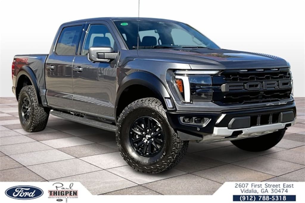 Carbonized Gray Metallic 2025 Ford F-150 Raptor 4WD 10-Speed Automatic 3.5L V6 EcoBoost Vidalia Ford Lincoln 2607 E 1st St Vidalia, Georgia 30474 912-788-5318 Equipment Group 801A Standard, 4D SuperCrew, 3.5L V6 EcoBoost, 10-Speed Automatic, 4WD, 14 Speakers, Navigation system: Connected Navigation, Radio data system, Radio: B&O Unleashed Sound System by Bang & Olufsen, SYNC 4 w/Enhanced Voice Recognition, 17" Cast Aluminum Wheels, 4-Wheel Disc Brakes, ABS brakes, Adjustable pedals, Air Conditioning, Alloy wheels, AM/FM radio: SiriusXM with 360L, Auto High-beam Headlights, Auto tilt-away steering wheel, Auto-dimming door mirrors, Auto-dimming Rear-View mirror, Automatic temperature control, Brake assist, Bumpers: body-color, Compass, Delay-off headlights, Driver door bin, Driver vanity mirror, Dual front impact airbags, Dual front side impact airbags, Electronic Locking w/4.10 Axle Ratio, Electronic Stability Control, Emergency communication system: SYNC 4 911 Assist, Front anti-roll bar, Front Bucket Seats, Front Center Armrest, Front dual zone A/C, Front fog lights, Front reading lights, Front wheel independent suspension, Fully automatic headlights, Garage door transmitter, Heads-Up Display, Heated door mirrors, Heated front seats, Heated rear seats, Heated steering wheel, Illuminated entry, Lane Departure Warning System, Leather steering wheel, Leather Trimmed Seats, Low tire pressure warning, Memory seat, Occupant sensing airbag, Outside temperature display, Overhead airbag, Overhead console, Panic alarm, Passenger door bin, Passenger vanity mirror, Pedal memory, Power door mirrors, Power driver seat, Power passenger seat, Power steering, Power windows, Rain sensing wipers, Rear reading lights, Rear step bumper, Rear window defroster, Remote keyless entry, Security system, Speed control, Speed-sensing steering, Split folding rear seat, Steering wheel memory, Steering wheel mounted audio controls, Tachometer, Telescoping steering wheel, Tilt steering wheel, Traction control, Trip computer, Turn signal indicator mirrors, Variably intermittent wipers, and Ventilated front seats. 12" LCD Color Touchscreen, 360-Degree Camera, 5G WiFi Hotspot Telematics, Adaptive Cruise Control, Auto Emergency Braking, Auto LED Headlights, Backup Camera, Blind Spot Monitoring, BLIS Blind Spot Info, Bluetooth w/ Streaming Audio, Lane Keeping System, Leather Seats, LED Fog Lights, LED Projector Headlights, Memory Package, Off Road Package, Panoramic Sunroof/Moonroof, Parking Sensors, Performance Package, Power Mirror Package, Power Package, Power Sliding Rear Window, Premium Sound Package, Pro Trailer Backup Assist, Pro Trailer Hitch Assist, Push Button Start, Remote Start, Reverse Sensing, Skid Plate Package, Tow Package, Trailer Package, 4D SuperCrew, 3.5L V6 EcoBoost, 10-Speed Automatic, 4WD, 14 Speakers, Equipment Group 801A Standard, Navigation system: Connected Navigation, Radio data system, Radio: B&O Unleashed Sound System by Bang & Olufsen, SYNC 4 w/Enhanced Voice Recognition.