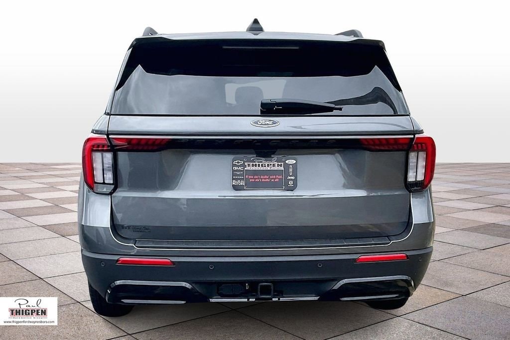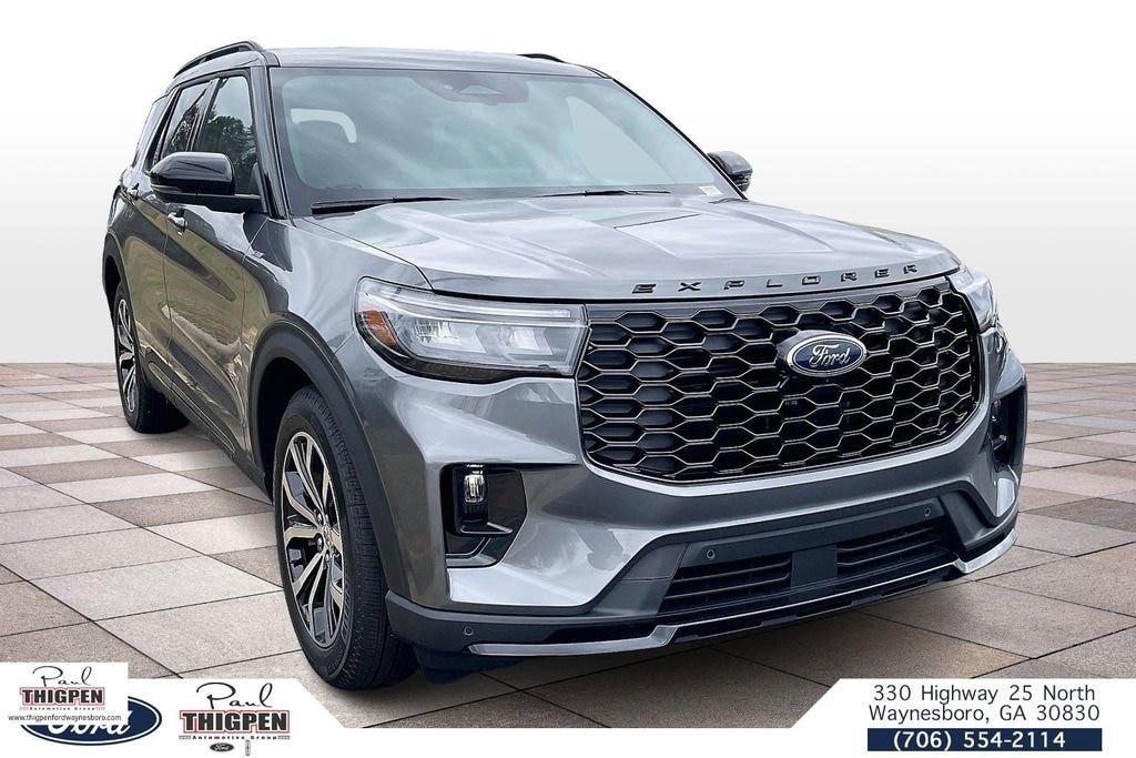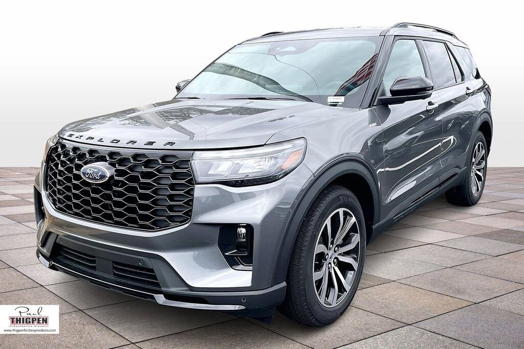 Gray Metallic 2026 Ford Explorer ST-Line RWD 10-Speed Automatic 2.3L EcoBoost I-4 10 Speakers, 3rd row seats: bench, 4-Wheel Disc Brakes, ABS brakes, Air Conditioning, Alloy wheels, AM/FM radio: SiriusXM with 360L, Apple CarPlay/Android Auto, Auto High-beam Headlights, Automatic temperature control, BlueCruise (equipment + 1-Year + 90-Day Plan), BlueCruise Hardware, Brake assist, Bumpers: body-color, Compass, Delay-off headlights, Driver door bin, Driver vanity mirror, Dual front impact airbags, Dual front side impact airbags, Electronic Stability Control, Emergency communication system: 911 Assist, Equipment Group 300A Standard Package, Exterior Parking Camera Rear, Four wheel independent suspension, Front anti-roll bar, Front Bucket Seats, Front Center Armrest, Front dual zone A/C, Front fog lights, Front reading lights, Fully automatic headlights, Garage door transmitter, Heated door mirrors, Heated front seats, Heated steering wheel, Heated Unique Cloth Captain's Chairs, Illuminated entry, Knee airbag, Leather steering wheel, Low tire pressure warning, Navigation System, Occupant sensing airbag, Outside temperature display, Overhead airbag, Overhead console, Panic alarm, Passenger door bin, Passenger vanity mirror, Power door mirrors, Power driver seat, Power Liftgate, Power passenger seat, Power steering, Power windows, Radio: B&O Sound System by Bang and Olufsen, Rear air conditioning, Rear anti-roll bar, Rear reading lights, Rear window defroster, Rear window wiper, Remote keyless entry, Security system, Speed control, Speed-sensing steering, Speed-Sensitive Wipers, Split folding rear seat, Spoiler, Steering wheel mounted audio controls, Tachometer, Telescoping steering wheel, Tilt steering wheel, Traction control, Trip computer, Variably intermittent wipers, Wheels: 20" Ebony-Painted Machined Aluminum.