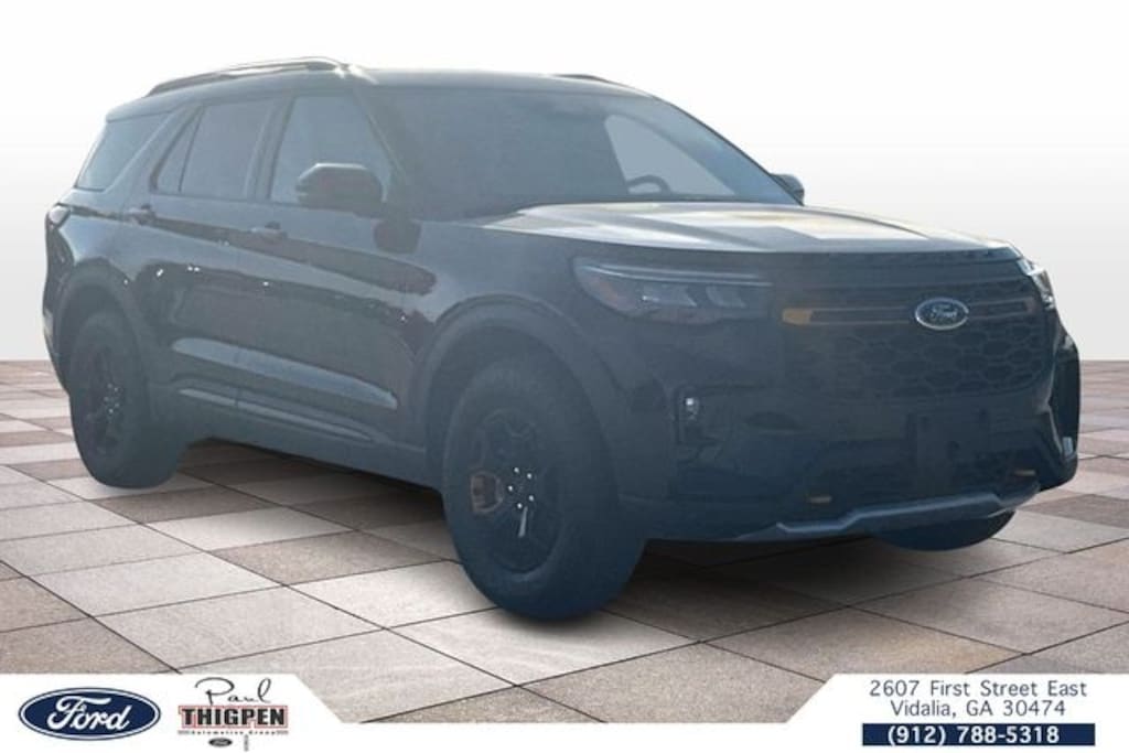 Agate Black Metallic 2026 Ford Explorer Tremor 4WD 10-Speed Automatic 3.0L EcoBoost V6 Vidalia Ford Lincoln 2607 E 1st St Vidalia, Georgia 30474 912-788-5318 4WD, 10 Speakers, 3rd row seats: bench, 4-Wheel Disc Brakes, ABS brakes, Air Conditioning, Alloy wheels, AM/FM radio: SiriusXM with 360L, Apple CarPlay/Android Auto, Auto High-beam Headlights, Automatic temperature control, Brake assist, Bumpers: body-color, Compass, Delay-off headlights, Driver door bin, Driver vanity mirror, Dual front impact airbags, Dual front side impact airbags, Electronic Stability Control, Emergency communication system: 911 Assist, Exterior Parking Camera Rear, Four wheel independent suspension, Front anti-roll bar, Front Bucket Seats, Front Center Armrest, Front dual zone A/C, Front fog lights, Front reading lights, Fully automatic headlights, Garage door transmitter, Heated door mirrors, Heated front seats, Heated rear seats, Heated steering wheel, Heated/Ventilated Miko Suede Captain's Chairs, Illuminated entry, Knee airbag, Leather steering wheel, Low tire pressure warning, Navigation System, Occupant sensing airbag, Outside temperature display, Overhead airbag, Overhead console, Panic alarm, Passenger door bin, Passenger vanity mirror, Power door mirrors, Power driver seat, Power Liftgate, Power passenger seat, Power steering, Power windows, Radio: B&O Sound System by Bang and Olufsen, Rear air conditioning, Rear anti-roll bar, Rear reading lights, Rear window defroster, Rear window wiper, Remote keyless entry, Security system, Speed control, Speed-sensing steering, Speed-Sensitive Wipers, Split folding rear seat, Spoiler, Sport steering wheel, Steering wheel mounted audio controls, Tachometer, Telescoping steering wheel, Tilt steering wheel, Traction control, Trip computer, Variably intermittent wipers, Ventilated front seats, and Wheels: 18" High Gloss Black-Painted Aluminum. 4WD. Price includes: $3500 - Retail Customer Cash. Exp. 04/30/2026