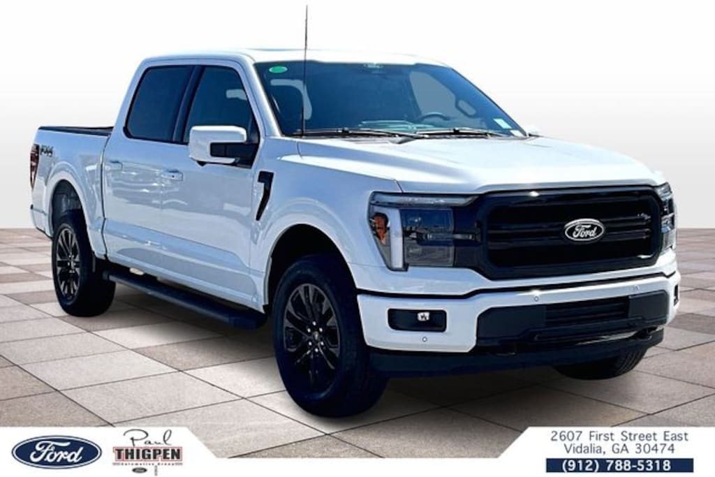 Star White Metallic Tri-Coat 2026 Ford F-150 Lariat 4WD 10-Speed Automatic 5.0L V8 Vidalia Ford Lincoln 2607 E 1st St Vidalia, Georgia 30474 912-788-5318 Ford Connectivity Package (1-Year Included), Internet access capable: 5G Modem - Ford Connectivity Package, 4WD, 3.31 Axle Ratio, 4-Wheel Disc Brakes, 8 Speakers, ABS brakes, Air Conditioning, Alloy wheels, AM/FM radio: SiriusXM with 360L, Auto High-beam Headlights, Auto-dimming door mirrors, Auto-dimming Rear-View mirror, Automatic temperature control, Brake assist, Bumpers: chrome, Chrome wheels, Compass, Delay-off headlights, Driver door bin, Driver vanity mirror, Dual front impact airbags, Dual front side impact airbags, Electronic Stability Control, Emergency communication system: SYNC 4 911 Assist, Front anti-roll bar, Front Bucket Seats, Front Center Armrest, Front dual zone A/C, Front fog lights, Front reading lights, Front wheel independent suspension, Fully automatic headlights, Garage door transmitter, Heated door mirrors, Heated front seats, Heated steering wheel, Illuminated entry, Low tire pressure warning, Memory seat, Navigation system: Connected Navigation, Occupant sensing airbag, Outside temperature display, Overhead airbag, Overhead console, Panic alarm, Passenger door bin, Passenger vanity mirror, Power door mirrors, Power driver seat, Power passenger seat, Power steering, Power windows, Radio data system, Radio: B&O Sound System by Bang and Olufsen, Rain sensing wipers, Rear reading lights, Rear seat center armrest, Rear step bumper, Rear window defroster, Remote keyless entry, Security system, Speed control, Split folding rear seat, Steering wheel mounted audio controls, SYNC 4 with Enhanced Voice Recognition, Tachometer, Telescoping steering wheel, Tilt steering wheel, Traction control, Trip computer, Turn signal indicator mirrors, Variably intermittent wipers, Ventilated front seats, and Wheels: 18" Chrome-Like PVD. 4WD. Price includes: $2500 - Retail Customer Cash. Exp. 04/30/2026
